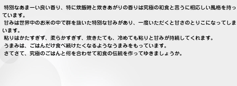 この品種の美味しさのひみつは草丈が高い稲の性質を最大限に発揮する事で、地中深くに根が張りより多くのミネラルを集めて凝縮していることで本来のお米の旨味が強烈にある事、甘味が強いこと、適度な粘りがある事、冷めても硬くなりにくいこと、香りが良いこと、健康を維持するために必要な条件を備えていること、命が輝いていること、外敵から私達を守る成分をより多くもっている事、等々考え得るすべての条件に対してすべて合格点である事は私達にとってとても大切なことです。